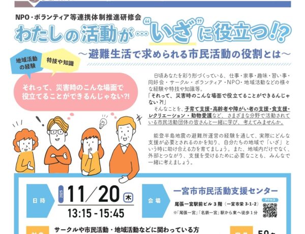 NPO・ボランティア等連携体制推進研修会 わたしの活動が・・・“いざ”に役立つ!? ~避難生活で求められる市民活動の役割とは~ 開催のご案内